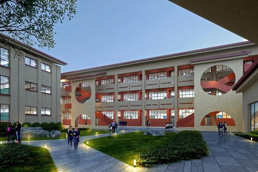 建筑沿地形展開(kāi)布置,向河面打開(kāi),將濱水景觀引入校園內(nèi)部。建筑方案通過(guò)切分、錯(cuò)位、組合等設(shè)計(jì)手法,形成錯(cuò)落有致的校園空間環(huán)境;迎合當(dāng)?shù)丶撅L(fēng),形成良好的采光通風(fēng)環(huán)境;同時(shí)結(jié)合當(dāng)?shù)叵募居昙钡奶攸c(diǎn),通過(guò)風(fēng)雨連廊串聯(lián)各建筑空間,圍合不同尺度的景觀庭院,營(yíng)造更多共享交流空間,打造多層次、多維度、人性化的景觀空間。